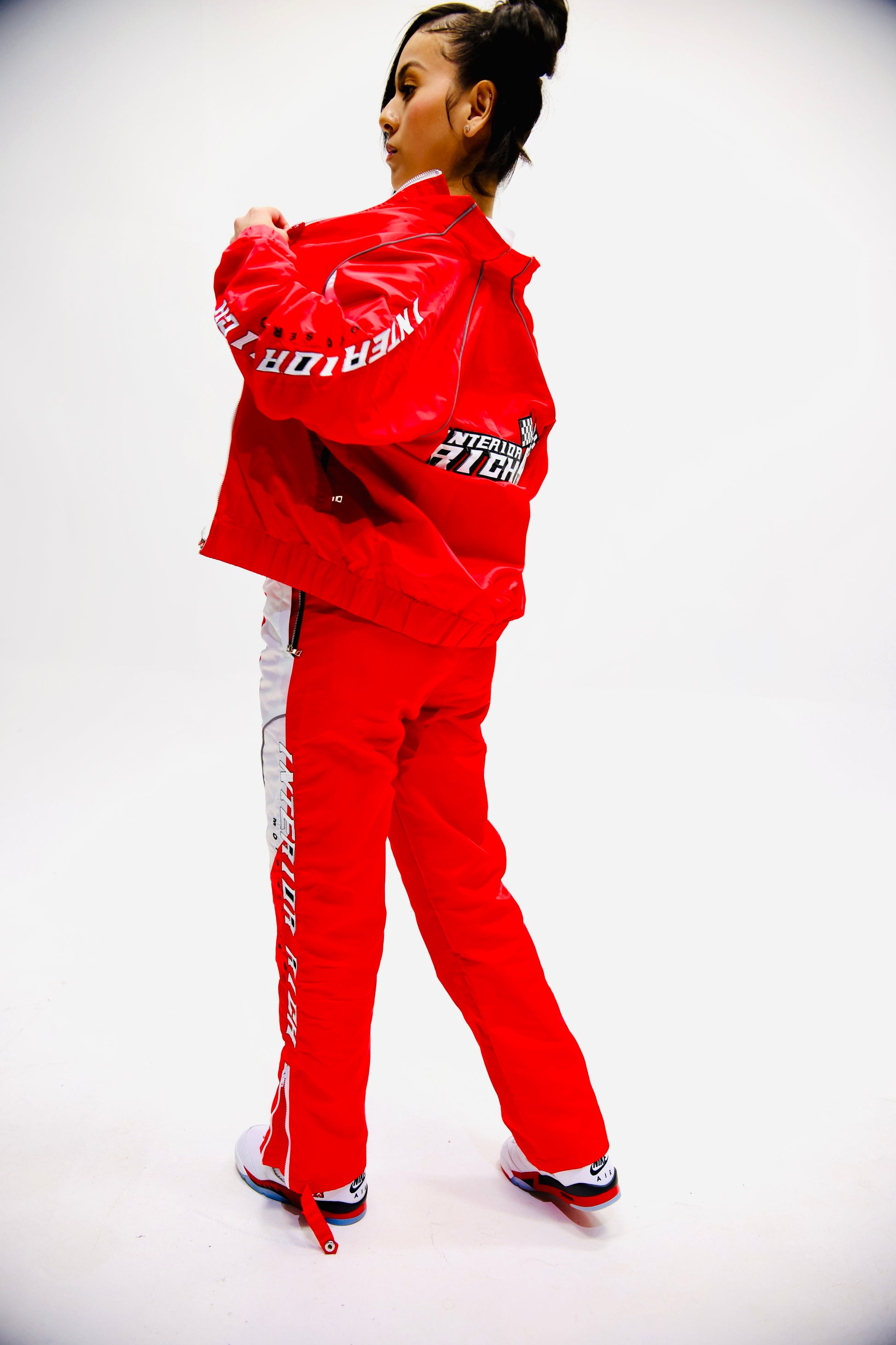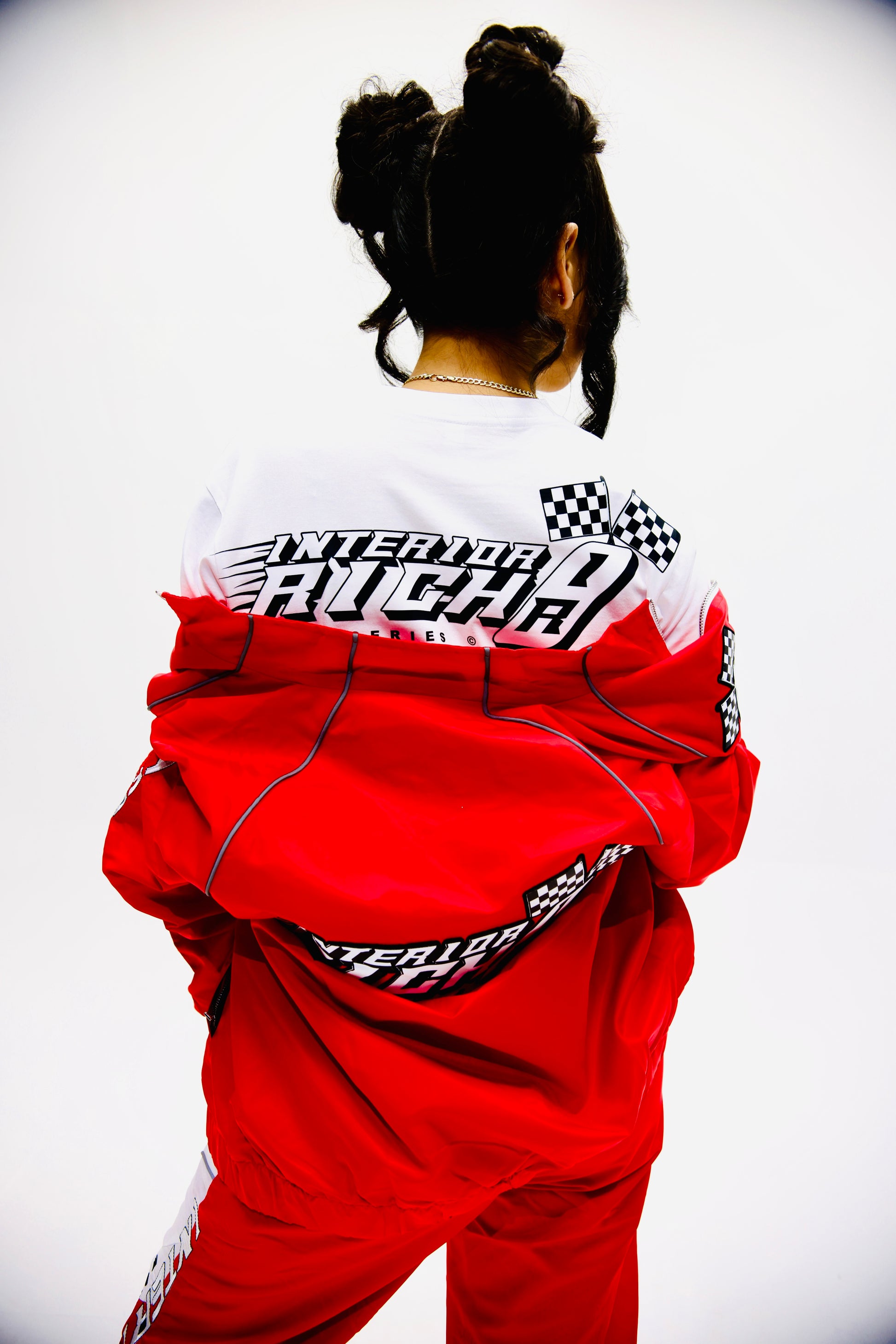 Level up your streetwear with the Interior Rich Trackstar 9 Nylon Racing Set, engineered for movement, style, and all-day comfort. This lightweight two-piece set blends motorsport energy with modern street aesthetics — featuring bold “Interior Rich” sleeve hits, checker flag detailing, and contrast grey paneling that brings the entire fit to life.